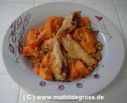 Fleisch in grobe Stücke schneiden mit Knoblauch und Kumin in einer Schüssel vermischen. Öl erhitzen und das Fleisch darin anbraten. Süßkartoffel schälen in grobe Stücke schneiden und mit dem Tomaten dazugeben. Mit Salz und Pfeffer würzen und garen bis die Kartoffeln fast weich sind. Dann Erbsen dazu weich garen und danach die Erdnussbutter und Zitronensaft beigeben.
