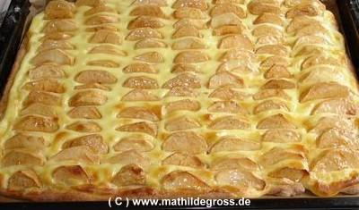 Äpfel schälen, vierteln, in Spalten schneiden und schuppenförmig auf den Pudding legen. Im vorgeheitzen Backofen bei 170°C Umluft 30-35 Minuten backen. Aprikosenmarmelade durch ein Sieb streichen mit Wasser und Apricot Brandy verrühren, kurz aufkochen lassen und den Kuchen sofort damit bestreichen.